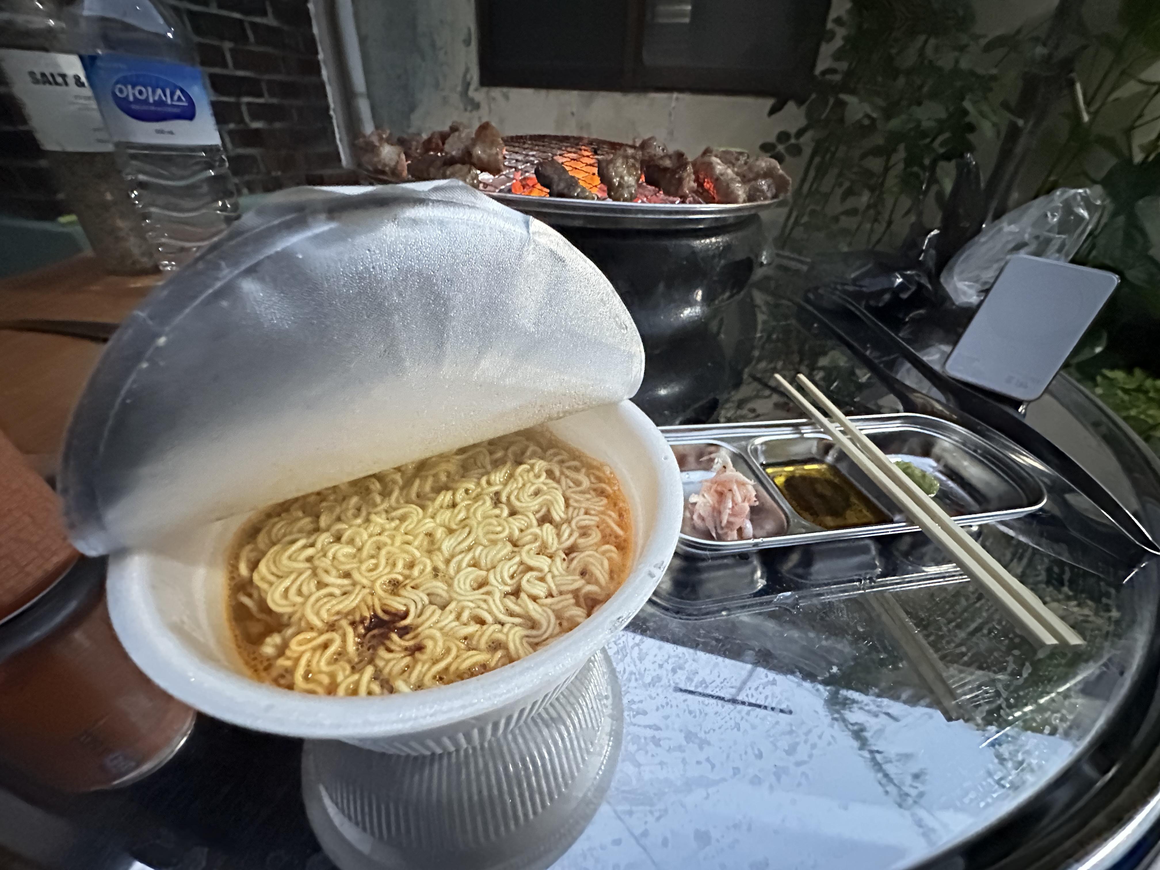 바베큐로만 끝내기 아쉬워서, 마지막으로 육개장 컵라면을 끓였어요. 바베큐와 라면 조합은 역시 진리죠! 고소한 고기를 먹고 나서 얼큰한 육개장 국물로 마무리하니 배도 든든하고 기분도 좋았어요. 날씨가 점점 쌀쌀해지는데, 따뜻한 라면 국물이 몸을 녹여주는 느낌이었습니다.
