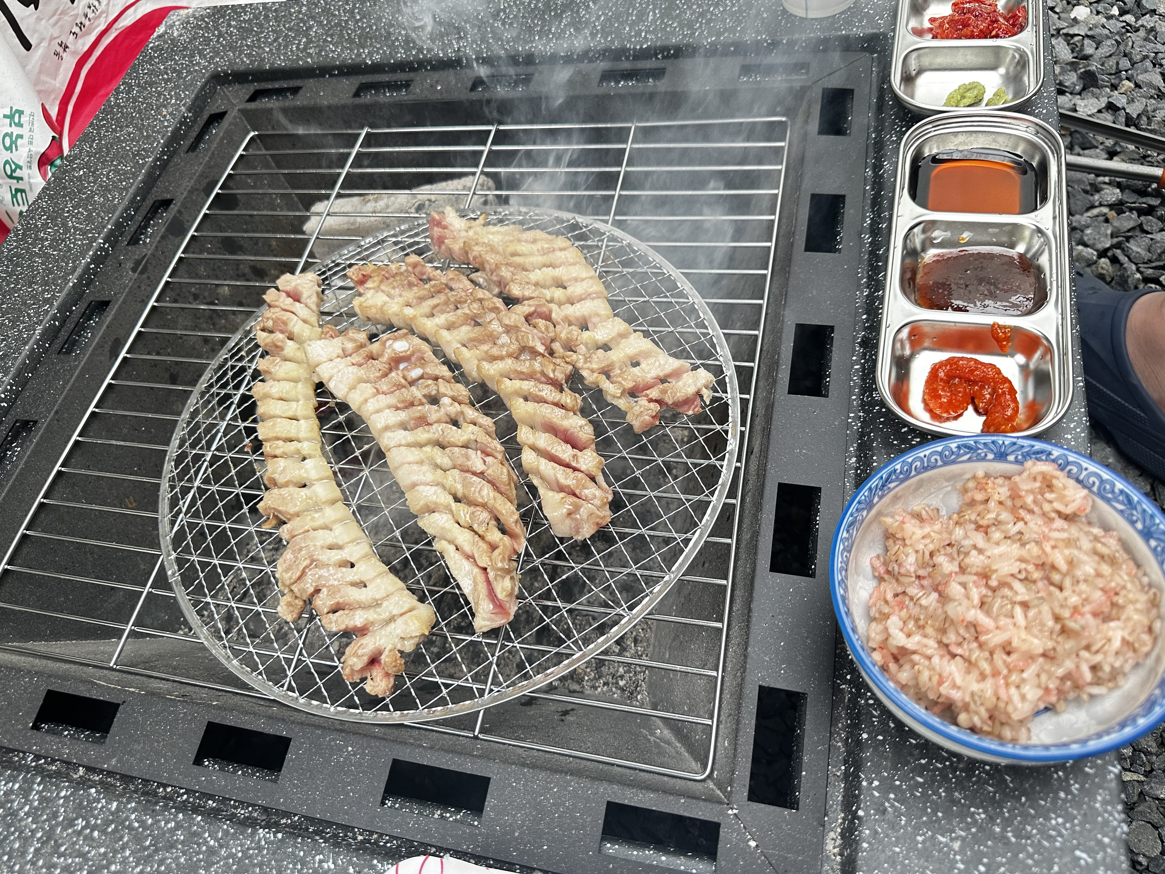 화로대에서 숯불로 구운 삼겹살은 역시 특별한 맛이 있어요. 숯불의 열이 고기에 골고루 전달되어 더 깊고 진한 풍미가 나고, 스테이크 소스 덕분에 조금 더 색다른 맛을 즐길 수 있었답니다. 🌟 친구들과 삼겹살을 먹으며 웃고 떠들다 보니 시간 가는 줄도 몰랐어요.