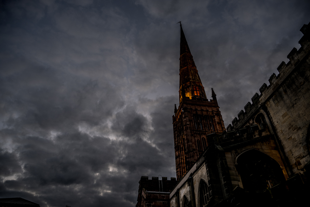 코벤트리의 랜드마크인 옛 대성당(Old Cathedral). 2차 대전 당시의 폭격으로 지붕과 창문은 사라졌지만, 남은 벽체와 첨탑을 철거하지 않고 그대로 보존해 두었다고 한다. 붉은 사암으로 지어진 높은 첨탑과 흐린 구름이 어우러져 영국만의 묵직한 분위기가 느껴졌다.